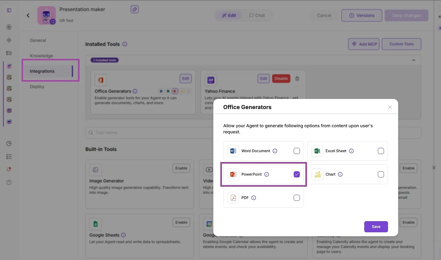 La generación de presentaciones puede habilitarse directamente a nivel de agente. Abre Edit Agent, ve a Integrations y selecciona Office Generators de la lista de herramientas integradas. Habilita PowerPoint (Presentations) para permitir que el agente produzca documentos de presentación estructurados como parte de su salida estándar.