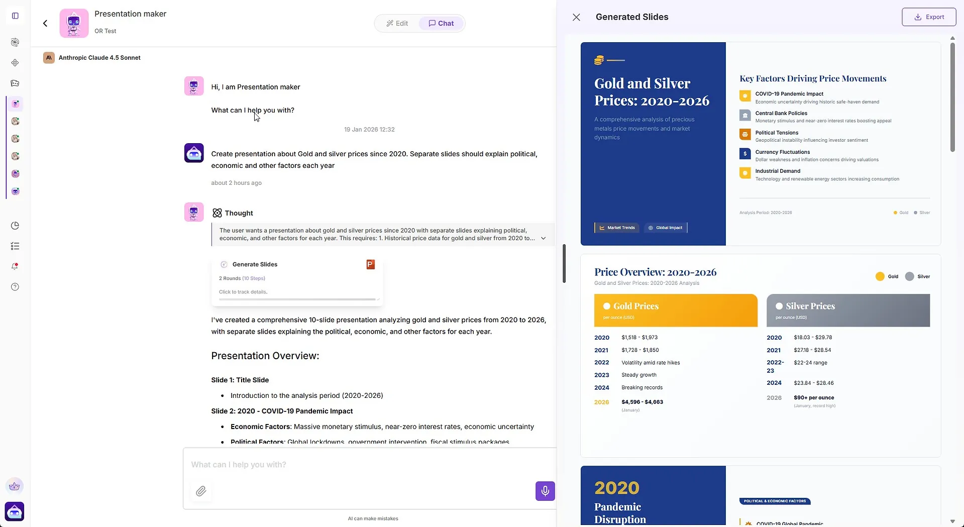 En este ejemplo, durante una conversación normal, el usuario le pidió al agente que creara una presentación analizando los precios del oro y la plata desde 2020, con una instrucción clara de separar los factores económicos, políticos y estructurales año por año.
