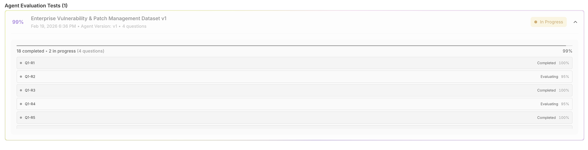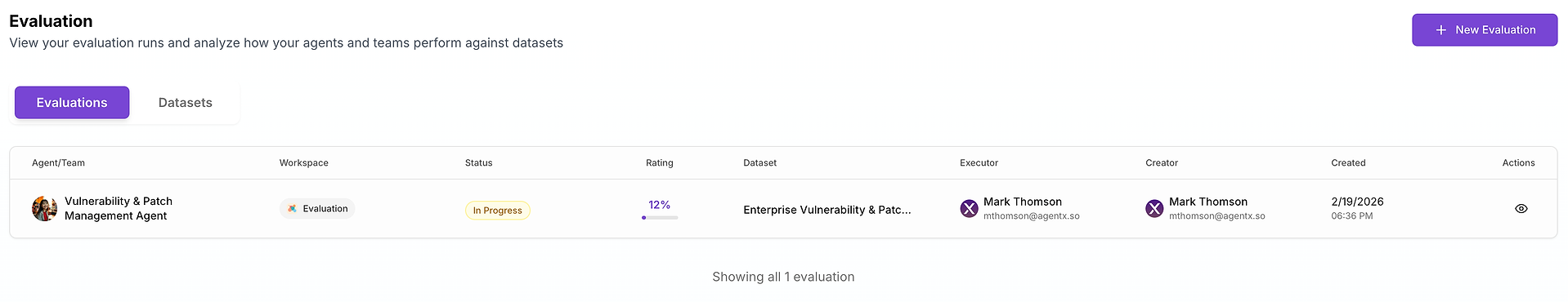 With your agent and dataset configured, clicking "Run Evaluation" initiates an automated, comprehensive testing sequence.