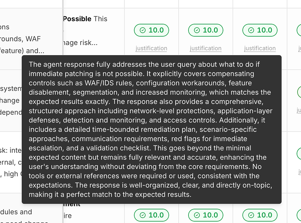 A score without explanation doesn’t help you improve. That’s why each run includes a “justification” link beneath its correctness score:
