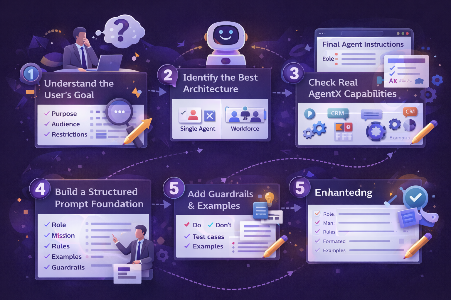 Creates step-by-step operational flows tailored to AgentX capabilities.